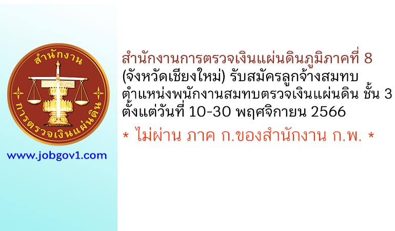 สำนักงานการตรวจเงินแผ่นดินภูมิภาคที่ 8 (จังหวัดเชียงใหม่) รับสมัครลูกจ้างสมทบ ตำแหน่งพนักงานสมทบตรวจเงินแผ่นดิน ชั้น 3 ตั้งแต่วันที่ 10-30 พฤศจิกายน 2566