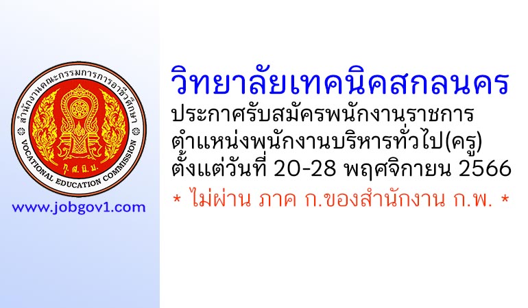 วิทยาลัยเทคนิคสกลนคร รับสมัครพนักงานราชการ ตำแหน่งพนักงานบริหารทั่วไป(ครู) ตั้งแต่วันที่ 20-28 พฤศจิกายน 2566