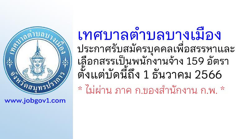 เทศบาลตำบลบางเมือง รับสมัครบุคคลเพื่อสรรหาและเลือกสรรเป็นพนักงานจ้าง 159 อัตรา ตั้งแต่บัดนี้ถึง 1 ธันวาคม 2566