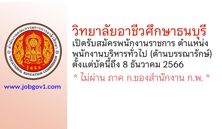 วิทยาลัยอาชีวศึกษาธนบุรี รับสมัครพนักงานราชการ ตำแหน่งพนักงานบริหารทั่วไป (ด้านบรรณารักษ์) ตั้งแต่บัดนี้ถึง 8 ธันวาคม 2566
