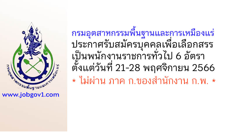 กรมอุตสาหกรรมพื้นฐานและการเหมืองแร่ รับสมัครบุคคลเพื่อเลือกสรรเป็นพนักงานราชการทั่วไป 6 อัตรา ตั้งแต่วันที่ 21-28 พฤศจิกายน 2566