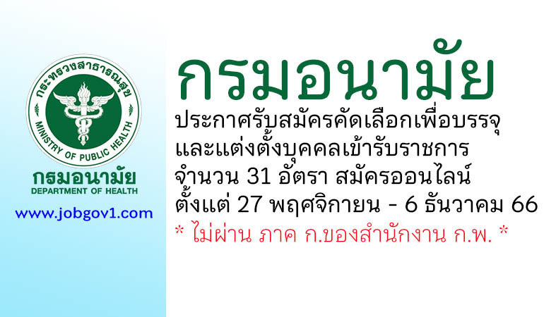 กรมอนามัย รับสมัครคัดเลือกเพื่อบรรจุและแต่งตั้งบุคคลเข้ารับราชการ 31 อัตรา ตั้งแต่ 27 พฤศจิกายน – 6 ธันวาคม 2566