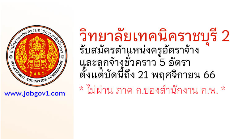 วิทยาลัยเทคนิคราชบุรี 2 รับสมัครครูอัตราจ้าง และลูกจ้างชั่วคราว 5 อัตรา ตั้งแต่บัดนี้ถึง 21 พฤศจิกายน 2566