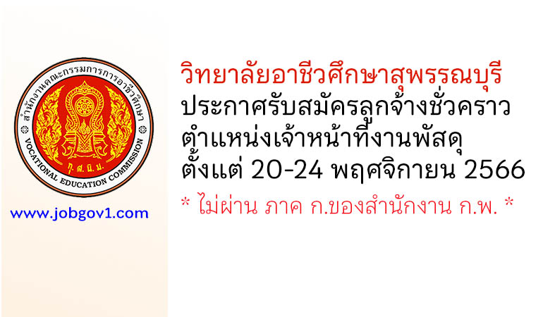 วิทยาลัยอาชีวศึกษาสุพรรณบุรี รับสมัครลูกจ้างชั่วคราว ตำแหน่งเจ้าหน้าที่งานพัสดุ ตั้งแต่วันที่ 20-24 พฤศจิกายน 2566