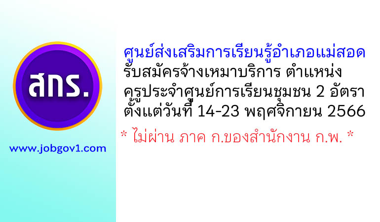ศูนย์ส่งเสริมการเรียนรู้อำเภอแม่สอด รับสมัครจ้างเหมาบริการ ตำแหน่งครูประจำศูนย์การเรียนชุมชน 2 อัตรา ตั้งแต่วันที่ 14-23 พฤศจิกายน 2566