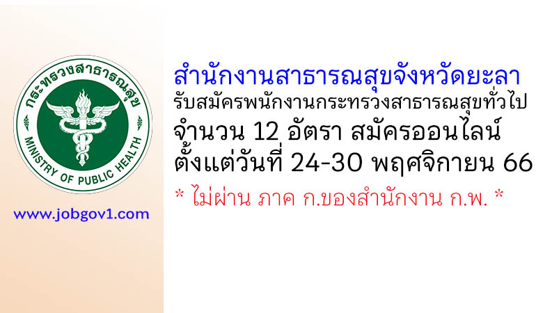 สำนักงานสาธารณสุขจังหวัดยะลา รับสมัครพนักงานกระทรวงสาธารณสุขทั่วไป 12 อัตรา ตั้งแต่วันที่ 24-30 พฤศจิกายน 2566