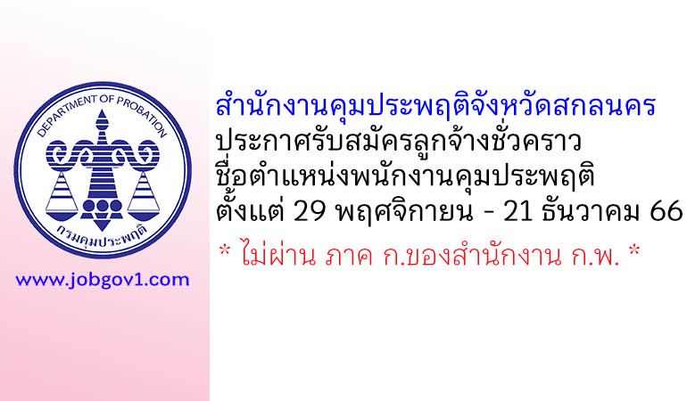 สำนักงานคุมประพฤติจังหวัดสกลนคร รับสมัครลูกจ้างชั่วคราว ตำแหน่งพนักงานคุมประพฤติ ตั้งแต่ 29 พฤศจิกายน – 21 ธันวาคม 2566