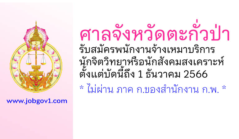 ศาลจังหวัดตะกั่วป่า รับสมัครพนักงานจ้างเหมาบริการ ตำแหน่งนักจิตวิทยาหรือนักสังคมสงเคราะห์ ตั้งแต่บัดนี้ถึง 1 ธันวาคม 2566