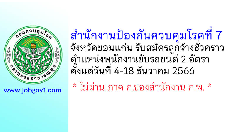 ประกาศสำนักงานป้องกันควบคุมโรคที่ 7 จังหวัดขอนแก่น เรื่อง รับสมัครคัดเลือกบุคคลเพื่อบรรจุเป็นลูกจ้างชั่วคราว ตำแหน่งพนักงานขับรถยนต์