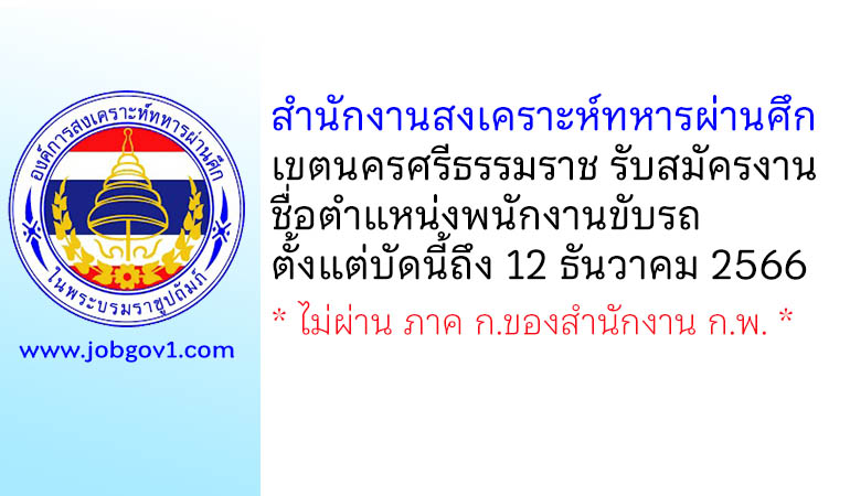 สำนักงานสงเคราะห์ทหารผ่านศึกเขตนครศรีธรรมราช รับสมัครบุคคลเข้าปฏิบัติงาน ตำแหน่งพนักงานขับรถ ตั้งแต่บัดนี้ถึง 12 ธันวาคม 2566