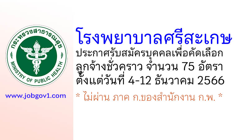 โรงพยาบาลศรีสะเกษ รับสมัครบุคคลเพื่อคัดเลือกลูกจ้างชั่วคราว 75 อัตรา ตั้งแต่วันที่ 4-12 ธันวาคม 2566