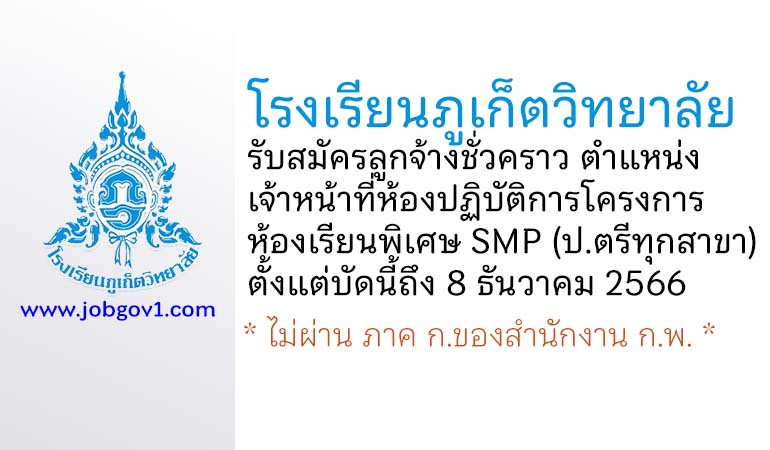 โรงเรียนภูเก็ตวิทยาลัย รับสมัครลูกจ้างชั่วคราว ตำแหน่งเจ้าหน้าที่ห้องปฏิบัติการโครงการห้องเรียนพิเศษ SMP ตั้งแต่บัดนี้ถึง 8 ธันวาคม 2566