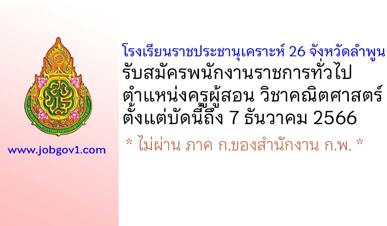 โรงเรียนราชประชานุเคราะห์ 26 จังหวัดลำพูน รับสมัครพนักงานราชการทั่วไป ตำแหน่งครูผู้สอน วิชาคณิตศาสตร์ ตั้งแต่บัดนี้ถึง 7 ธันวาคม 2566
