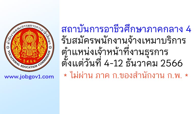 สถาบันการอาชีวศึกษาภาคกลาง 4 รับสมัครพนักงานจ้างเหมาบริการ ตำแหน่งเจ้าหน้าที่งานธุรการ ตั้งแต่วันที่ 4-12 ธันวาคม 2566