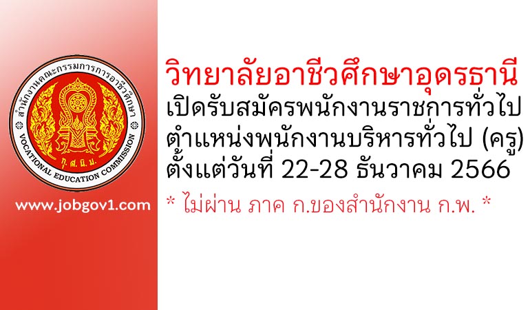 วิทยาลัยอาชีวศึกษาอุดรธานี รับสมัครพนักงานราชการทั่วไป ตำแหน่งพนักงานบริหารทั่วไป (ครู) ตั้งแต่วันที่ 22-28 ธันวาคม 2566