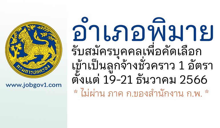 อำเภอพิมาย รับสมัครบุคคลเพื่อคัดเลือกเข้าเป็นลูกจ้างชั่วคราว 1 อัตรา ตั้งแต่วันที่ 19-21 ธันวาคม 2566