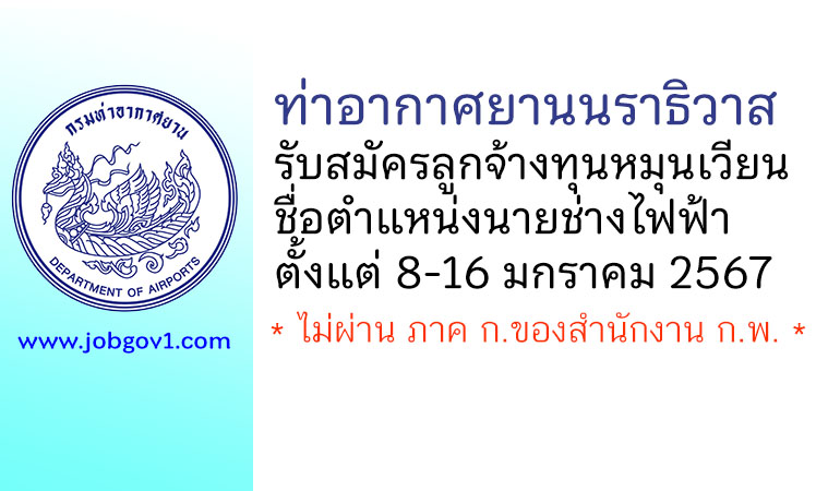 ประกาศกรมท่าอากาศยาน เรื่อง รับสมัครสอบคัดเลือกบุคคลเพื่อเลือกสรรและจัดจ้างเป็นลูกจ้างทุนหมุนเวียนในตำแหน่งนายช่างไฟฟ้า ปฏิบัติงานที่ท่าอากาศยานนราธิวาส