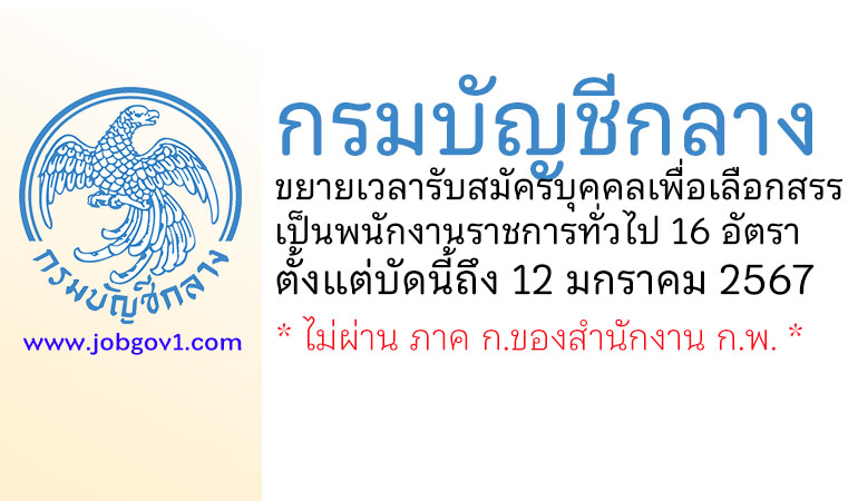 กรมบัญชีกลาง ขยายเวลารับสมัครบุคคลเพื่อเลือกสรรเป็นพนักงานราชการทั่วไป 16 อัตรา ตั้งแต่บัดนี้ถึง 12 มกราคม 2567