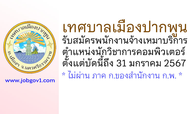 เทศบาลเมืองปากพูน รับสมัครพนักงานจ้างเหมาบริการ ตำแหน่งนักวิชาการคอมพิวเตอร์ ตั้งแต่บัดนี้ถึง 31 มกราคม 2567