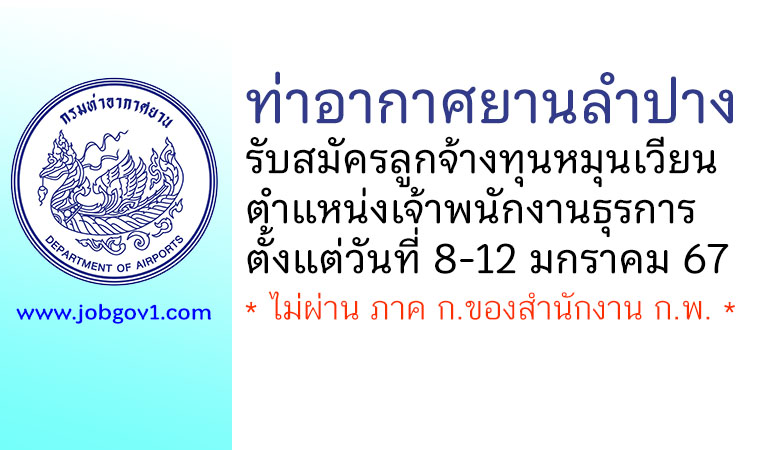 ประกาศกรมท่าอากาศยาน เรื่อง รับสมัครสอบคัดเลือกบุคคลเพื่อเลือกสรรและจัดจ้างเป็นลูกจ้างทุนหมุนเวียนในตำแหน่ง เจ้าพนักงานธุรการ ปฏิบัติงานที่ ท่าอากาศยานลำปาง