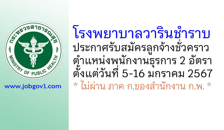 โรงพยาบาลวารินชำราบ รับสมัครลูกจ้างชั่วคราว ตำแหน่งพนักงานธุรการ 2 อัตรา ตั้งแต่วันที่ 5-16 มกราคม 2567