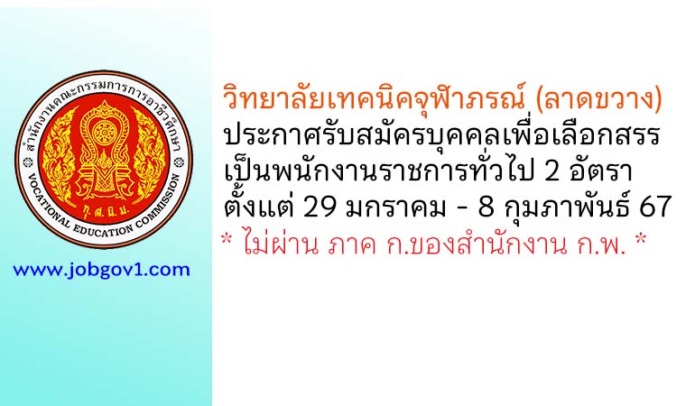 วิทยาลัยเทคนิคจุฬาภรณ์ (ลาดขวาง) รับสมัครบุคคลเพื่อเลือกสรรเป็นพนักงานราชการทั่วไป 2 อัตรา ตั้งแต่ 29 มกราคม – 8 กุมภาพันธ์ 2567