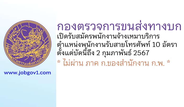กองตรวจการขนส่งทางบก รับสมัครพนักงานจ้างเหมาบริการ ตำแหน่งพนักงานรับสายโทรศัพท์ 10 อัตรา ตั้งแต่บัดนี้ถึง 2 กุมภาพันธ์ 2567