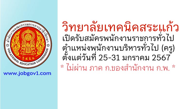 วิทยาลัยเทคนิคสระแก้ว รับสมัครพนักงานราชการทั่วไป ตำแหน่งพนักงานบริหารทั่วไป (ครู) ตั้งแต่วันที่ 25-31 มกราคม 2567