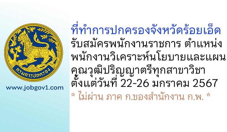 ที่ทำการปกครองจังหวัดร้อยเอ็ด รับสมัครพนักงานราชการทั่วไป ตำแหน่งพนักงานวิเคราะห์นโยบายและแผน ตั้งแต่วันที่ 22-26 มกราคม 2567