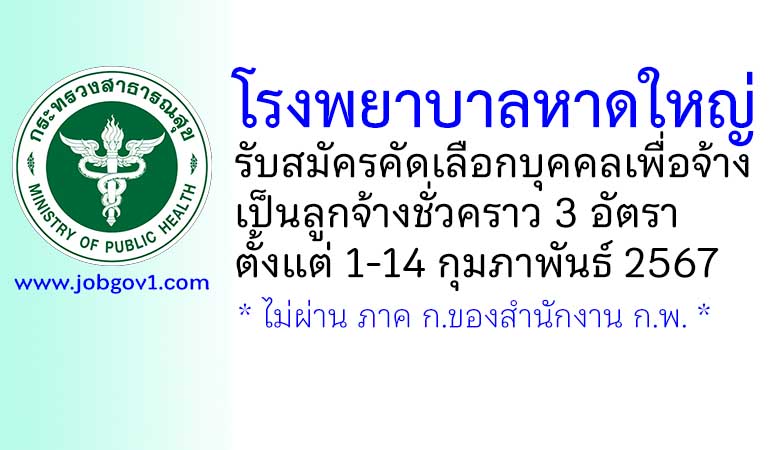 โรงพยาบาลหาดใหญ่ รับสมัครคัดเลือกบุคคลเพื่อจ้างเป็นลูกจ้างชั่วคราว 3 อัตรา ตั้งแต่วันที่ 1-14 กุมภาพันธ์ 2567