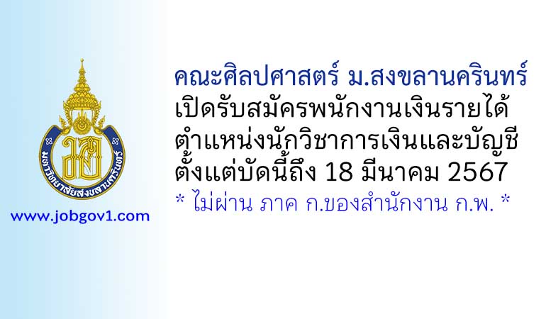 คณะศิลปศาสตร์ มหาวิทยาลัยสงขลานครินทร์ รับสมัครพนักงานเงินรายได้ ตำแหน่งนักวิชาการเงินและบัญชี ตั้งแต่บัดนี้ถึง 18 มีนาคม 2567