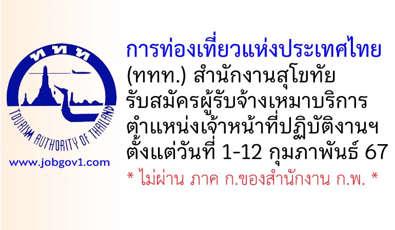 การท่องเที่ยวแห่งประเทศไทย (ททท.) สำนักงานสุโขทัย รับสมัครผู้รับจ้างเหมาบริการ ตำแหน่งเจ้าหน้าที่ปฏิบัติงานฯ ตั้งแต่วันที่ 1-12 กุมภาพันธ์ 2567