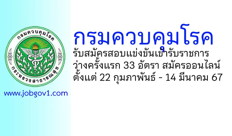 กรมควบคุมโรค รับสมัครสอบแข่งขันเพื่อบรรจุและแต่งตั้งบุคคลเข้ารับราชการ ว่างครั้งแรก 33 อัตรา ตั้งแต่ 22 กุมภาพันธ์ – 14 มีนาคม 2567