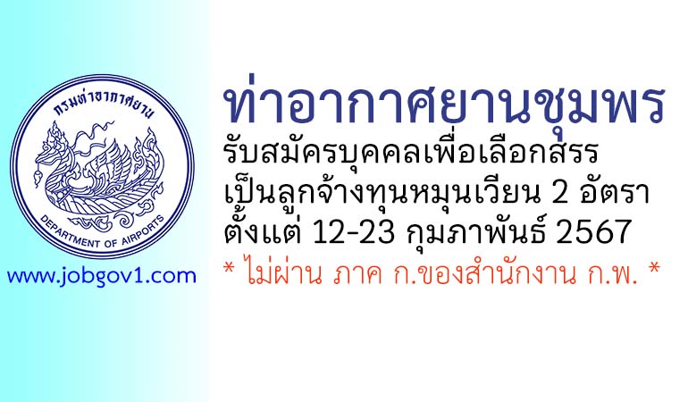ท่าอากาศยานชุมพร รับสมัครบุคคลเพื่อเลือกสรรเป็นลูกจ้างทุนหมุนเวียน 2 อัตรา ตั้งแต่วันที่ 12-23 กุมภาพันธ์ 2567