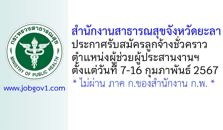 สำนักงานสาธารณสุขจังหวัดยะลา รับสมัครลูกจ้างชั่วคราว ตำแหน่งผู้ช่วยผู้ประสานงานฯ ตั้งแต่วันที่ 7-16 กุมภาพันธ์ 2567