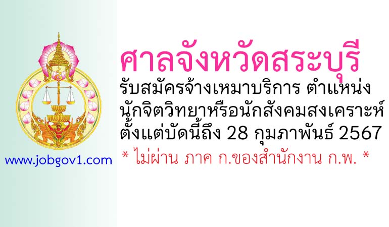 ศาลจังหวัดสระบุรี รับสมัครพนักงานจ้างเหมาบริการ ตำแหน่งนักจิตวิทยาหรือนักสังคมสงเคราะห์ ตั้งแต่บัดนี้ถึง 28 กุมภาพันธ์ 2567