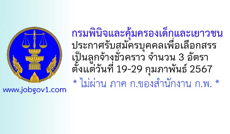 กรมพินิจและคุ้มครองเด็กและเยาวชน รับสมัครบุคคลเพื่อเลือกสรรเป็นลูกจ้างชั่วคราว 3 อัตรา ตั้งแต่วันที่ 19-29 กุมภาพันธ์ 2567