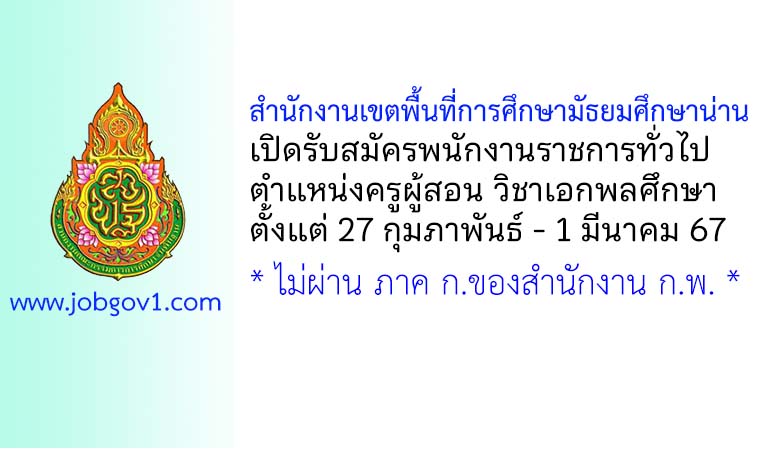 สพม.น่าน รับสมัครพนักงานราชการทั่วไป ตำแหน่งครูผู้สอน วิชาเอกพลศึกษา ตั้งแต่ 27 กุมภาพันธ์ – 1 มีนาคม 2567