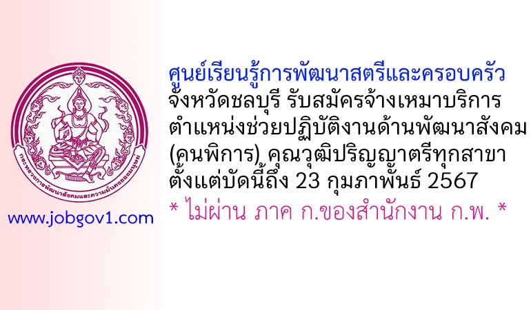 ศูนย์เรียนรู้การพัฒนาสตรีและครอบครัว จังหวัดชลบุรี รับสมัครพนักงานจ้างเหมาบริการ ตำแหน่งช่วยปฏิบัติงานด้านพัฒนาสังคม (คนพิการ) ตั้งแต่บัดนี้ถึง 23 กุมภาพันธ์ 2567