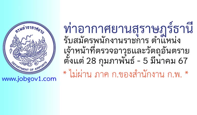 ประกาศกรมท่าอากาศยาน เรื่อง รับสมัครบุคคลเพื่อเลือกสรรและจัดจ้างเป็นพนักงานราชการทั่วไป ตำแหน่งเจ้าหน้าที่ตรวจอาวุธ และวัตถุอันตราย ปฏิบัติงานที่ท่าอากาศยานสุราษฎร์ธานี สังกัดกรมท่าอากาศยาน