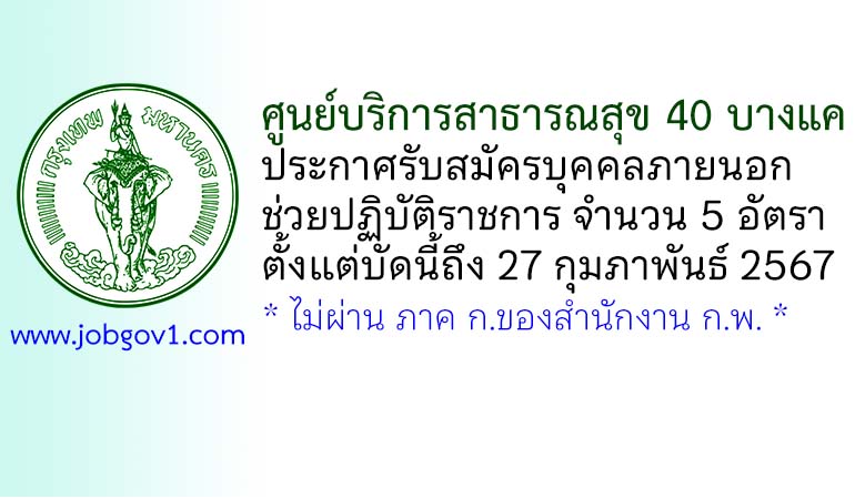 ศูนย์บริการสาธารณสุข 40 บางแค รับสมัครบุคคลภายนอกช่วยปฏิบัติราชการ 5 อัตรา ตั้งแต่บัดนี้ถึง 27 กุมภาพันธ์ 2567