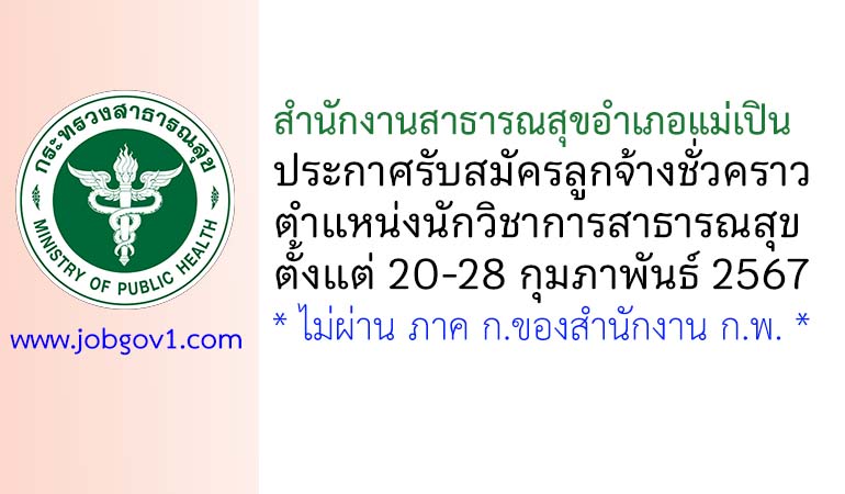 สำนักงานสาธารณสุขอำเภอแม่เปิน รับสมัครลูกจ้างชั่วคราว ตำแหน่งนักวิชาการสาธารณสุข ตั้งแต่วันที่ 20-28 กุมภาพันธ์ 2567
