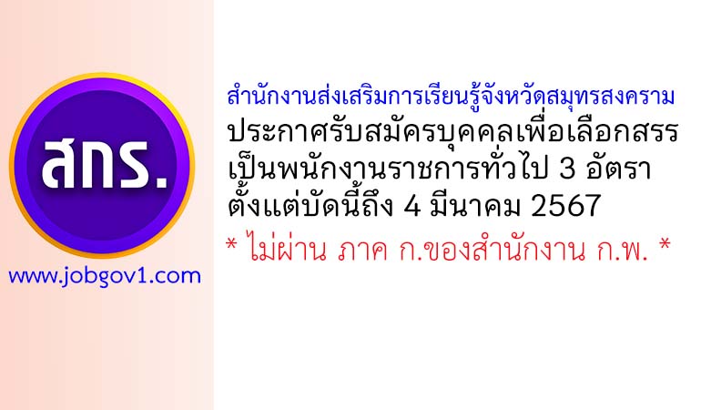 สำนักงานส่งเสริมการเรียนรู้จังหวัดสมุทรสงคราม รับสมัครบุคคลเพื่อเลือกสรรเป็นพนักงานราชการทั่วไป 3 อัตรา ตั้งแต่บัดนี้ถึง 4 มีนาคม 2567