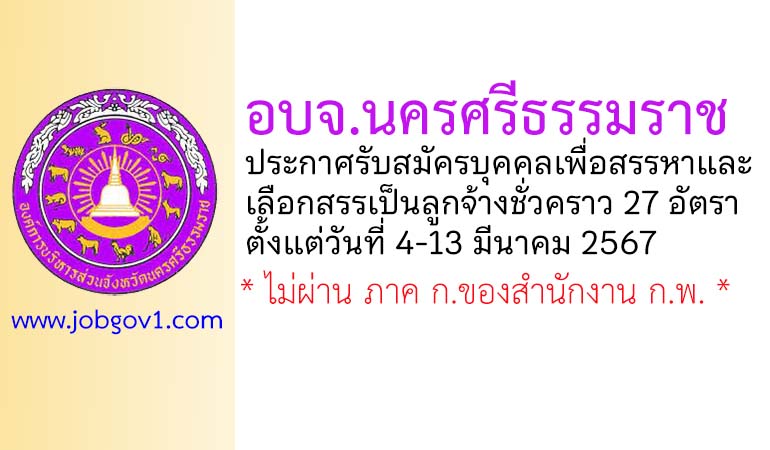 อบจ.นครศรีธรรมราช รับสมัครบุคคลเพื่อสรรหาและเลือกสรรเป็นลูกจ้างชั่วคราว 27 อัตรา ตั้งแต่วันที่ 4-13 มีนาคม 2567