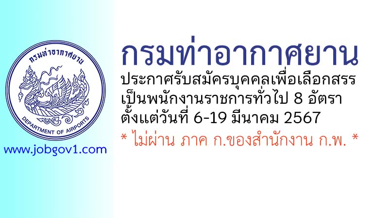 กรมท่าอากาศยาน รับสมัครบุคคลเพื่อเลือกสรรเป็นพนักงานราชการทั่วไป 8 อัตรา ตั้งแต่วันที่ 6-19 มีนาคม 2567