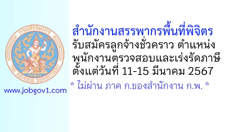 สำนักงานสรรพากรพื้นที่พิจิตร รับสมัครลูกจ้างชั่วคราว ตำแหน่งพนักงานตรวจสอบและเร่งรัดภาษี ตั้งแต่วันที่ 11-15 มีนาคม 2567