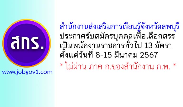 สำนักงานส่งเสริมการเรียนรู้จังหวัดลพบุรี รับสมัครบุคคลเพื่อเลือกสรรเป็นพนักงานราชการทั่วไป 13 อัตรา ตั้งแต่วันที่ 8-15 มีนาคม 2567