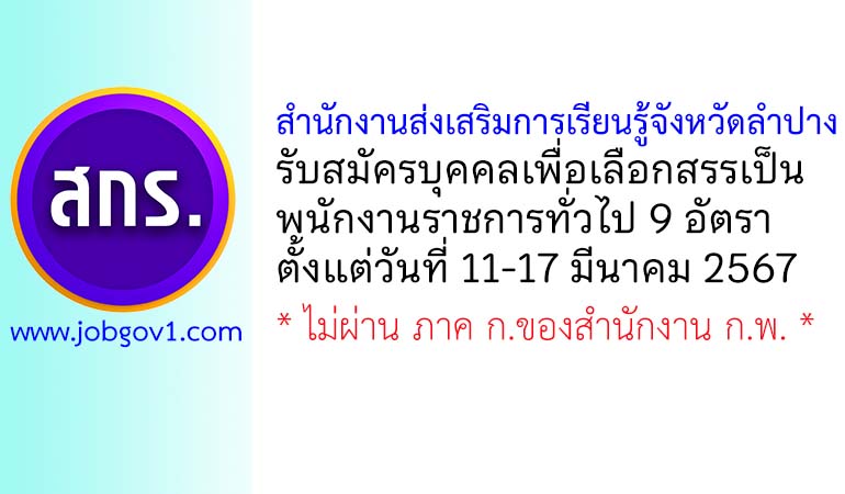สำนักงานส่งเสริมการเรียนรู้จังหวัดลำปาง รับสมัครบุคคลเพื่อเลือกสรรเป็นพนักงานราชการทั่วไป 9 อัตรา ตั้งแต่วันที่ 11-17 มีนาคม 2567