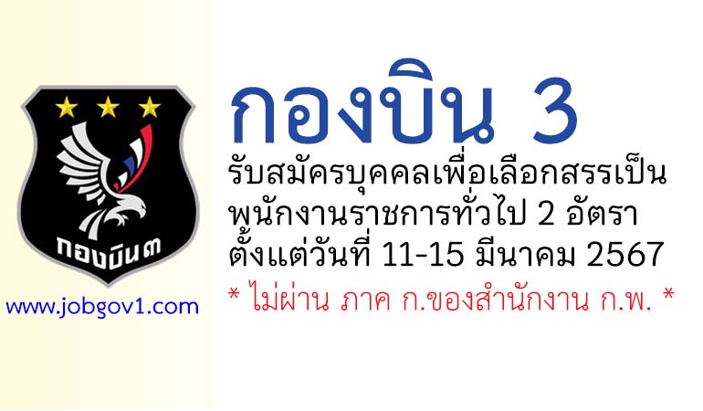 กองบิน 3 รับสมัครบุคคลเพื่อเลือกสรรเป็นพนักงานราชการ 2 อัตรา ตั้งแต่วันที่ 11-15 มีนาคม 2567