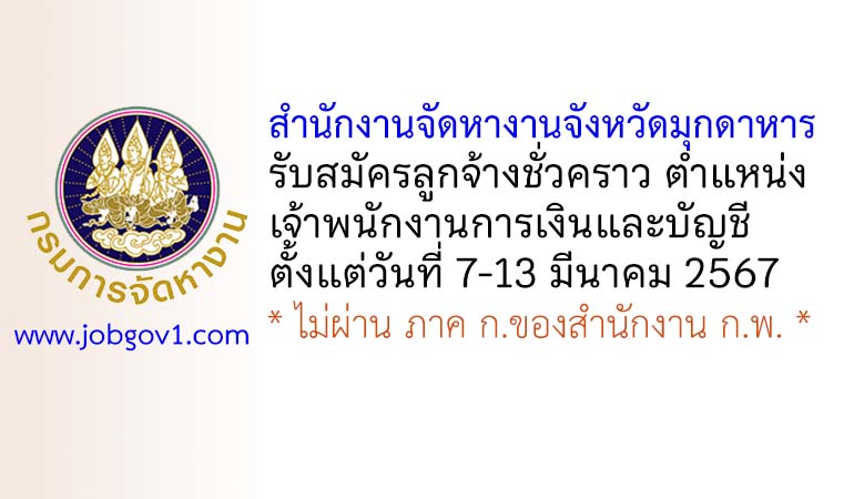 สำนักงานจัดหางานจังหวัดมุกดาหาร รับสมัครลูกจ้างชั่วคราว ตำแหน่งเจ้าพนักงานการเงินและบัญชี ตั้งแต่วันที่ 7-13 มีนาคม 2567